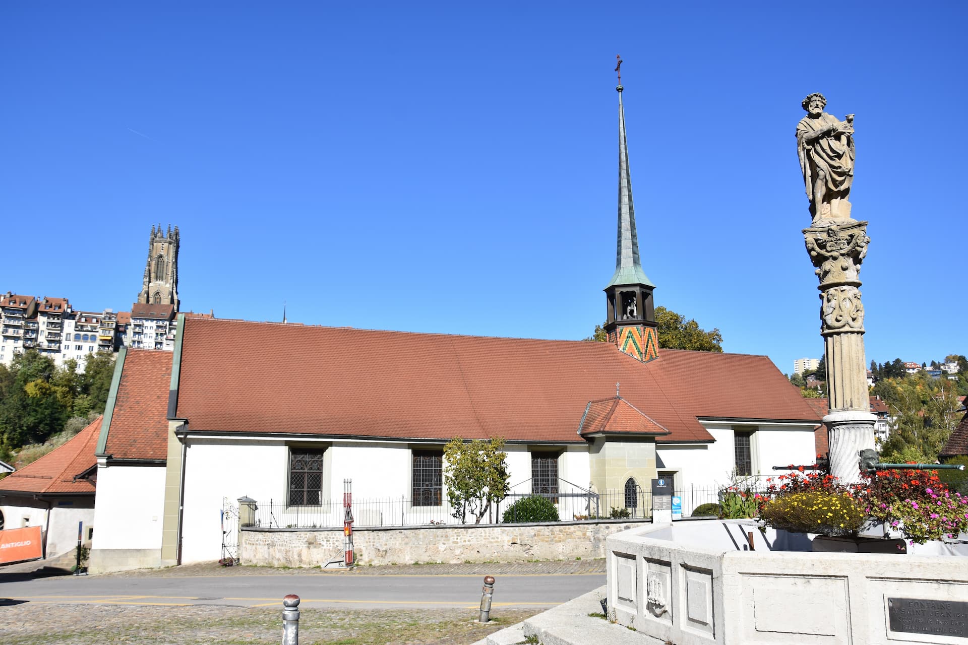 La plaza donde se asienta esta iglesia funciona como punto de encuentro entre el pasado y el presente de la ciudad baja de Friburgo. Aquí, los friburgueses hacen una pausa en sus paseos junto al Sarine, los turistas capturan imágenes del imponente Caserne de la Planche (un granero del siglo XVIII), y los peregrinos encuentran un momento de recogimiento antes de continuar su ruta hacia la Capilla de Lorette.