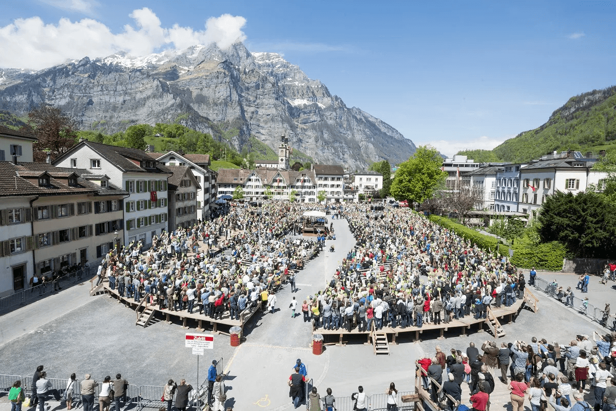 El primer domingo de mayo marca la fecha más importante del calendario glarnerense. Desde las 9:30 de la mañana, el Zaunplatz se transforma en el escenario de la Landsgemeinde, donde aproximadamente el 10% de los ciudadanos con derecho a voto (calculado por análisis fotográfico reciente) forma el "ring" democrático.